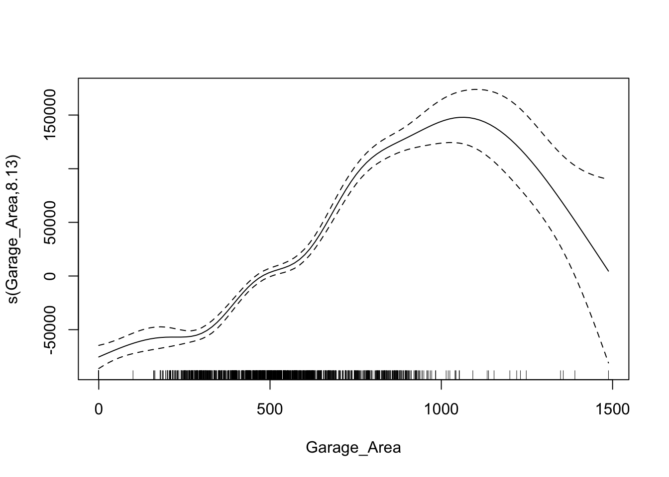 From the output above we see two different sections - a section for coefficients that are not involved in splines and a section for smoothing terms. The p-value attached to the spline of GrLivArea shows the significance of that variable to the model as a whole. Similar to the EARTH algorithm, we can view a plot of the relationship between the variable and its predictions of the target. Here we use the plot function on the gam model object.