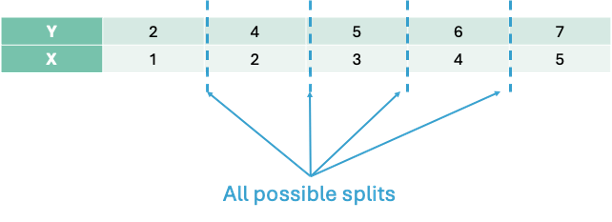 We must split the data into 2 pieces based on the values of X. Here are all of the possible splits: