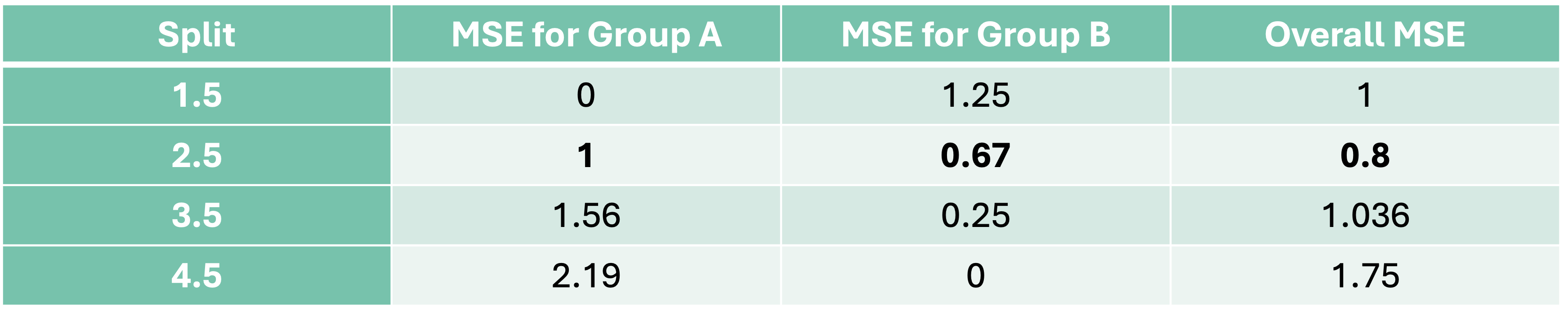 Let’s continue the above example with the CART approach to decision trees. We will make the best split based on MSE. We want a split that will minimize the MSE for our predictions. Since we have the predictions for the first split above, let’s calculate the MSE for each group: