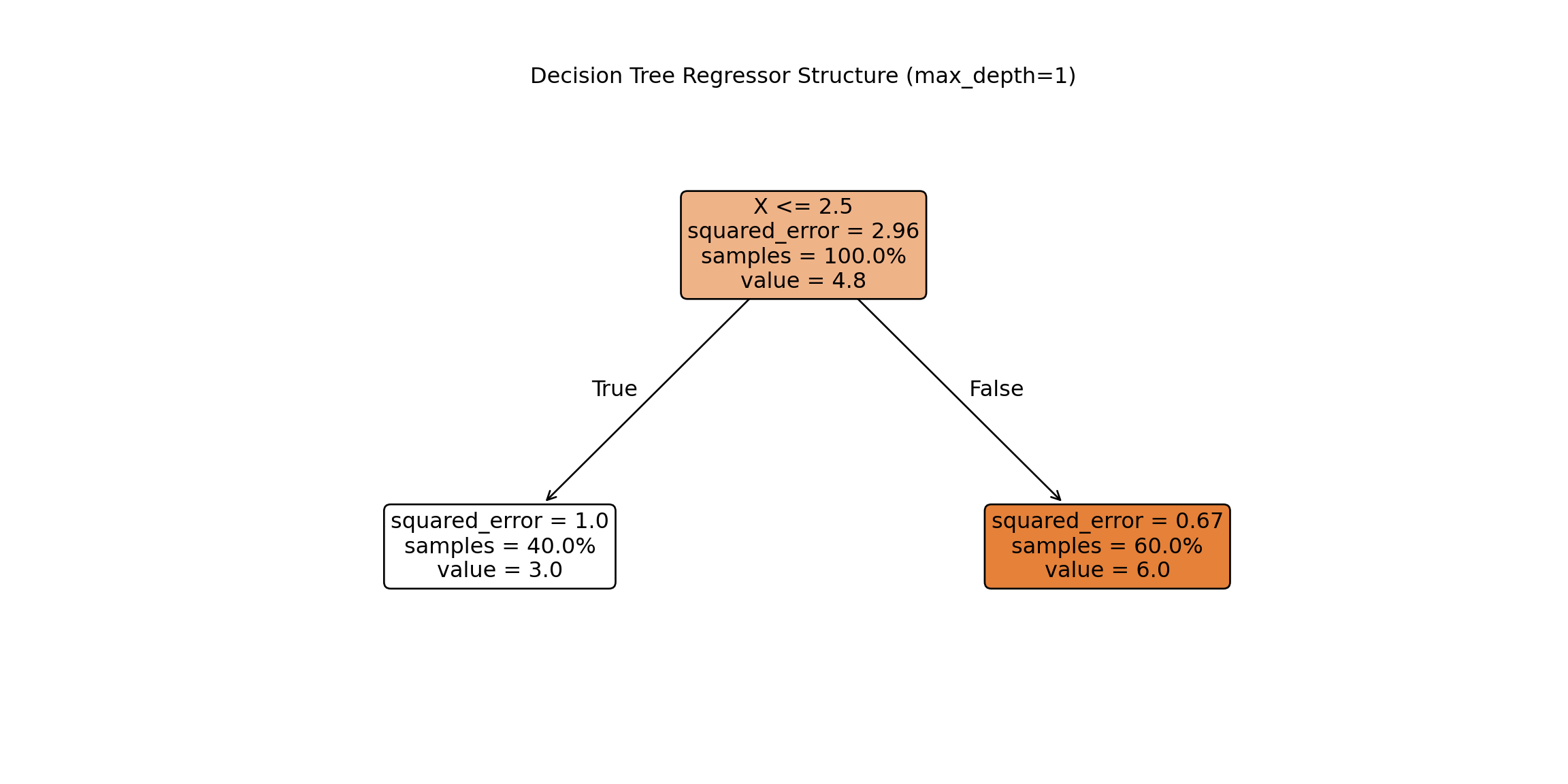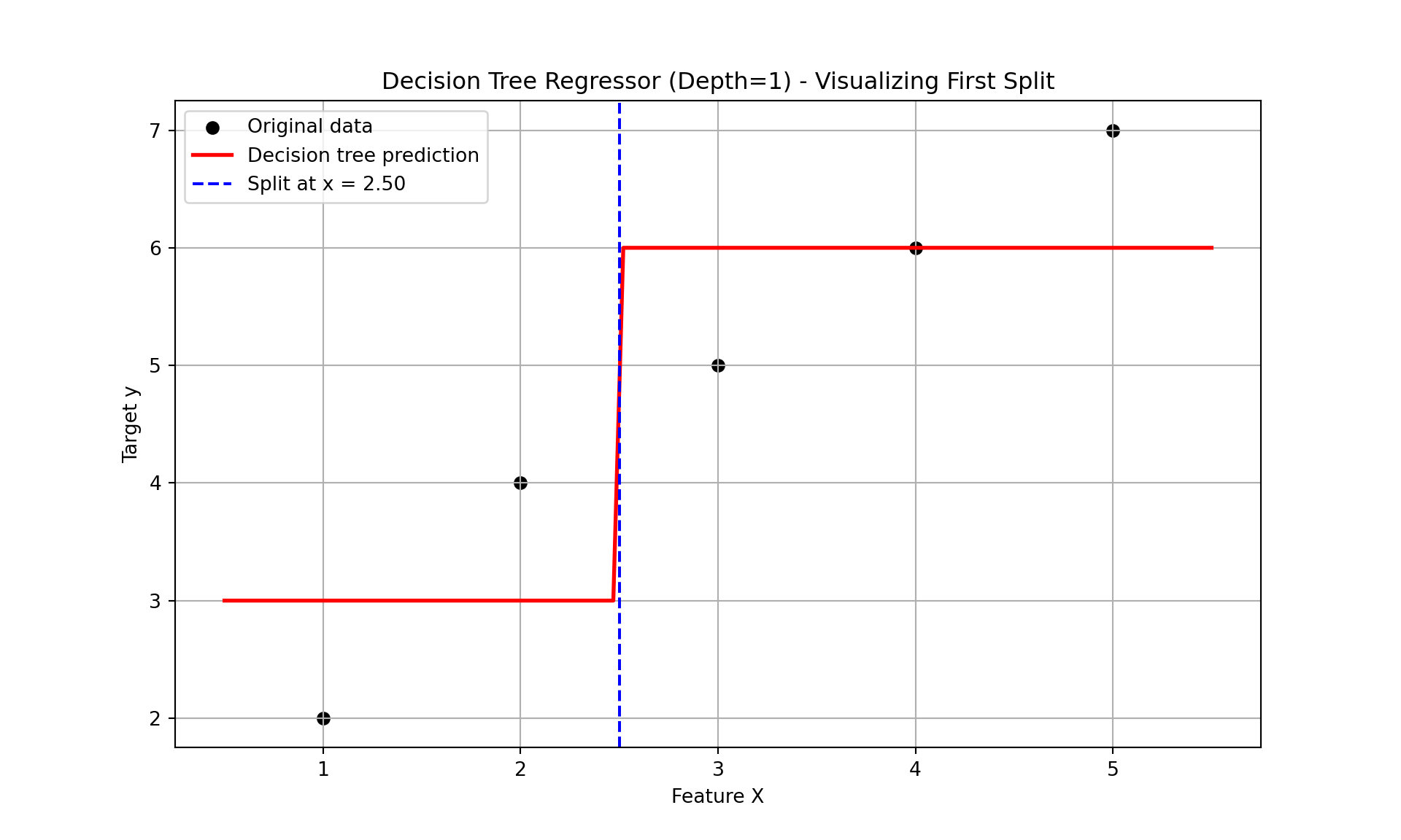 import numpy as npimport matplotlib.pyplot as pltfrom sklearn.tree import DecisionTreeRegressor# Simple regression datasetX_little = np.array([[1], [2], [3], [4], [5]])y_little = np.array([2, 4, 5, 6, 7])# Fit regression tree with max_depth = 1 (only one split)model = DecisionTreeRegressor(max_depth =1)model.fit(X_little, y_little)