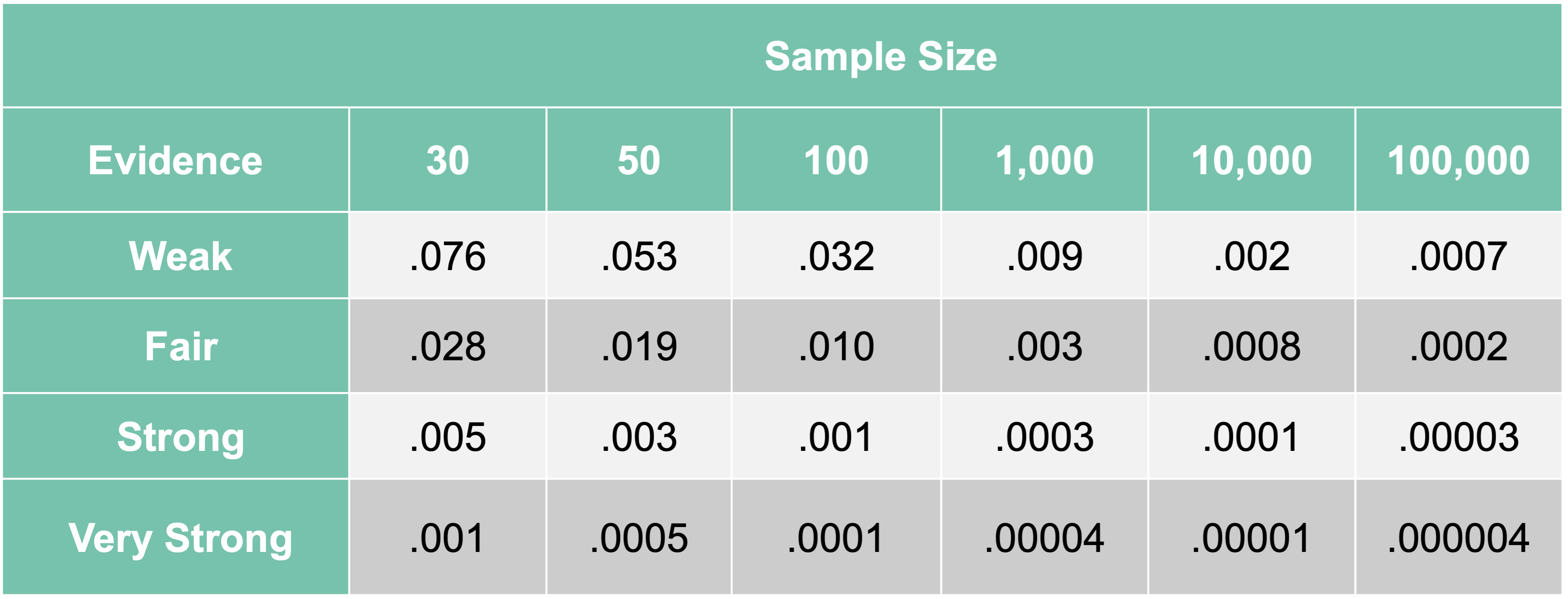 As we can see, an \(\alpha\)-level of 0.05 is good for sample sizes of about 50 for finding weak relationships. For the sample size of our data, a cut-off of about 0.009 is much more reasonable. We still want to find anything with at least a weak relationship with our target since we don’t want to be too restrictive this early on.