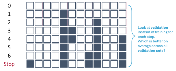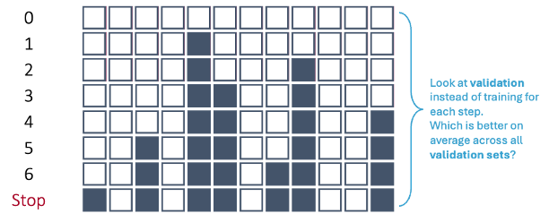 The more machine learning / computer science approach is slightly different. You still use the validation to evaluate which model is “best” at each step in the process. However, instead of taking the variables in the final step of the process as the final variables to use, we look at the **number of variables** in the final step of the process as what has been optimized. To score a final test data set, you would combine the training and validation sets and then build a model with the **same number of variables** in the final process, but the variables don’t need to be the same as the ones in the final step of the process. The variables might be different because of the combining of the training and validation data sets.