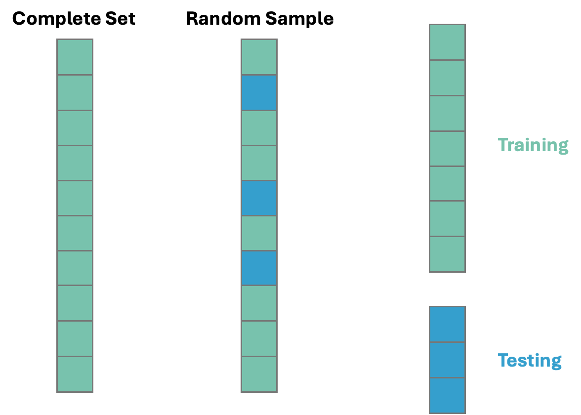 This split is done randomly. However, to make sure we can replicate this random split we use the random_state option. The data is split randomly so that the testing data set will approximate an honest assessment of how the model will perform in a real world setting. A visual representation of this is below: