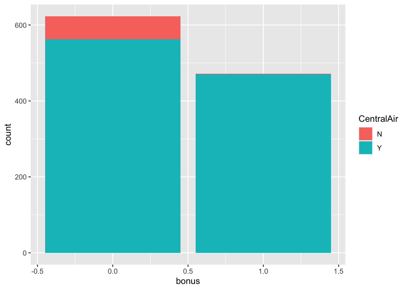 Let’s look at the distribution of both bonus eligibility and central air using the table function. The ggplot function with the geom_bar function allows us to view our data in a bar chart.