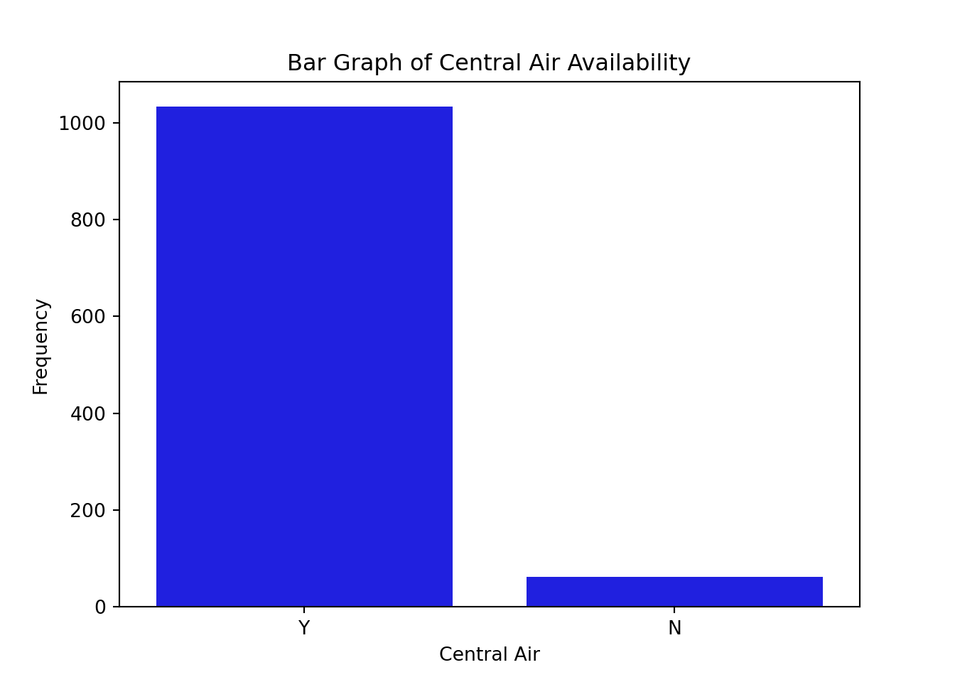 plt.cla()ax = sns.countplot(x ="CentralAir", data = train, color ="blue")ax.set(xlabel ='Central Air', ylabel ='Frequency', title ='Bar Graph of Central Air Availability')plt.show()
