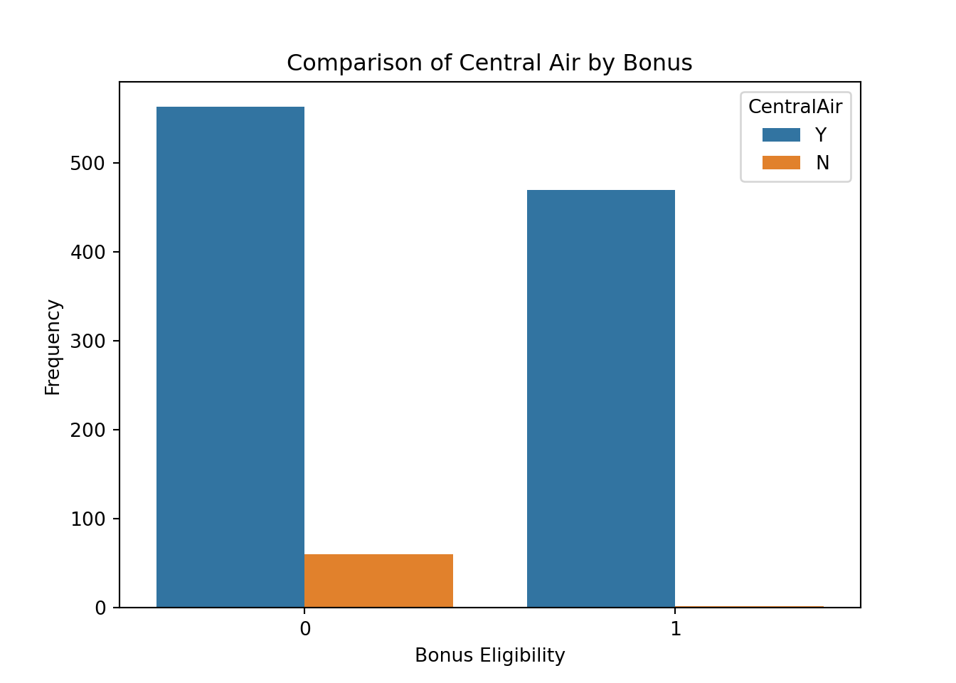 From the above output we can see that 62 homes have no central air with only 2 of them being bonus eligible. However, there are 1033 homes that have central air with 470 of them being bonus eligible.