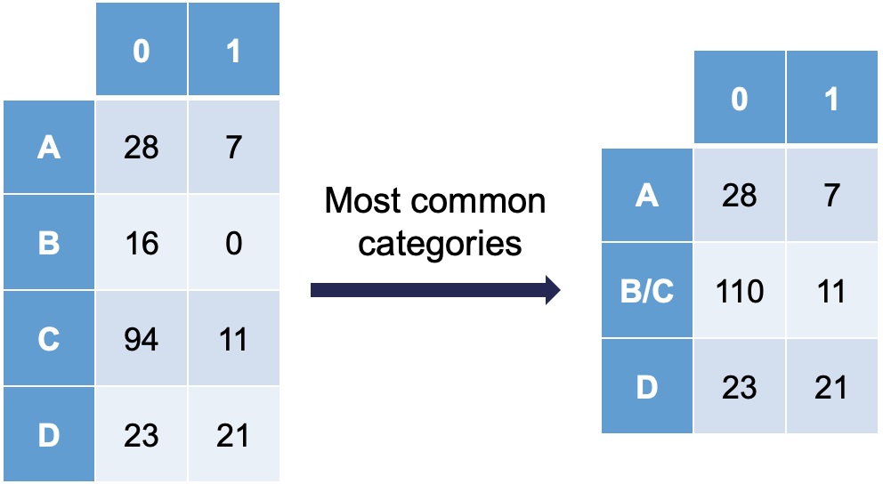 Notice how category C is most similar to category B (the problem category) in terms of its ratio of 0's and 1's. Formally, this method of combining categories is also called the Greenacre method.