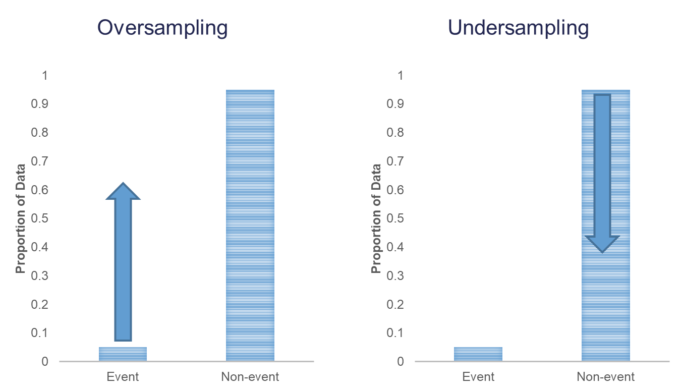 Undersampling is when we randomly sample only enough observations from the non-events in our training data set to balance out with events. This will make our training data set size much smaller. These are both represented in the following figure: