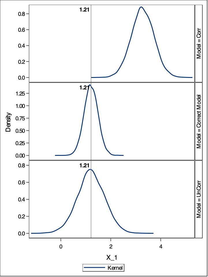 /* Run all regressions and store the output */proc reg data = all_data outest = all_results tableout noprint; OLSC: model Y = X_1 X_2; Corr: model Y = X_1; UnCorr: model Yu = X_1; by sim;run;/* Give meaningful values to the _model_ variable */data all_results; set all_results; label _model_="Model";ifupcase(_model_) eq "Corr" then _model_="Omit Correl. X";elseifupcase(_model_) eq "UnCorr" then _model_="Omit Uncorrel. X"; elseifupcase(_model_) eq "OLSC" then _model_="Correct Model";run;/* Normal plots and univariate statistics for each variable/model */proc sort data=all_results; by _model_;run;/* Create a panel of plots, by model, to contrast normal vs. empirical distr. AKA Make things look pretty... *//* Also add a reference line that highlights the true parameter value */proc sgpanel data =all_results(where=(_type_ eq 'PARMS')); panelby _model_ / layout=ROWLATTICE uniscale=column columns=1 onepanel; density X_1 / type=kernel; refline &Beta1 / axis=x label="&Beta1" labelattrs=(weight=bold);run;