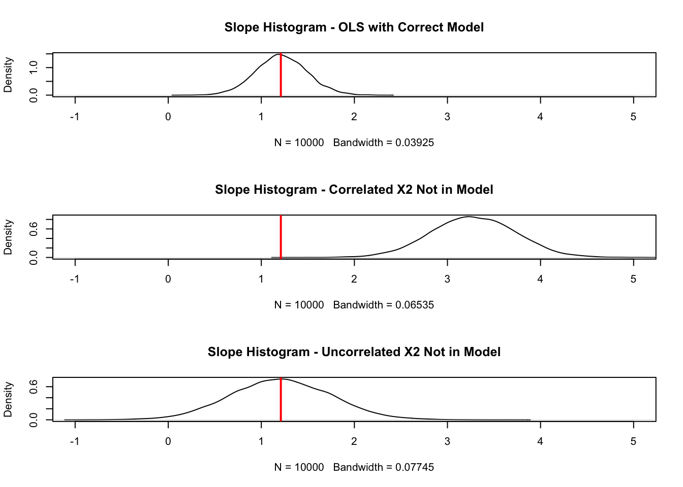 # Running regressions across every column. #all_results_c <-lapply(1:simulation.size, function(x) lm(Y.c[,x] ~ X1.c[,x]))all_results_uc <-lapply(1:simulation.size, function(x) lm(Y.uc[,x] ~ X1.c[,x]))all_results_ols <-lapply(1:simulation.size, function(x) lm(Y.c[,x] ~ X1.c[,x] + X2.c[,x]))# Gathering and plotting the distribution of the coefficients. #betas_c <-sapply(all_results_c, coef)betas_uc <-sapply(all_results_uc, coef)betas_ols <-sapply(all_results_ols, coef)par(mfrow=c(3,1))plot(density(betas_ols[2,]), xlim =c(-1,5), main ="Slope Histogram - OLS with Correct Model")abline(v =1.21, col="red", lwd=2)plot(density(betas_c[2,]), xlim =c(-1,5), main ="Slope Histogram - Correlated X2 Not in Model")abline(v =1.21, col="red", lwd=2)plot(density(betas_uc[2,]), xlim =c(-1,5), main ="Slope Histogram - Uncorrelated X2 Not in Model")abline(v =1.21, col="red", lwd=2)