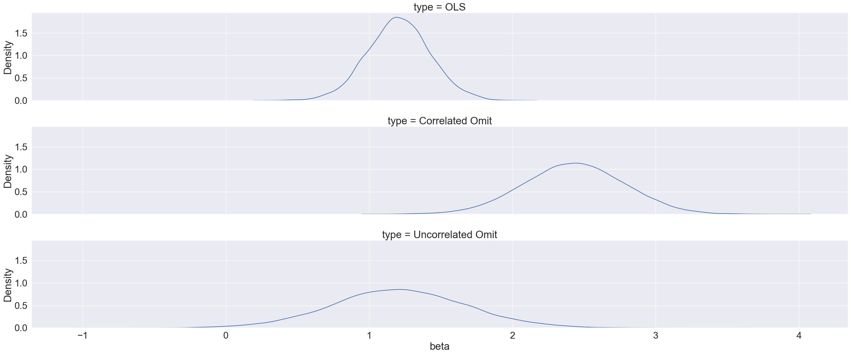 Now we get to run the regressions. We use a for loop to apply the ols function (for building linear regressions) from statsmodels.formula.api across all three types of models. The betas_c object has the linear regressions leaving out a correlated \(X_2\). The betas_uc object has the linear regressions leaving out a uncorrelated \(X_{2u}\). The betas_ols object has the correct linear regressions leaving out no variables. From there, we use the params function across each of our linear regressions to get the coefficients from \(X_1\) from each of the models.