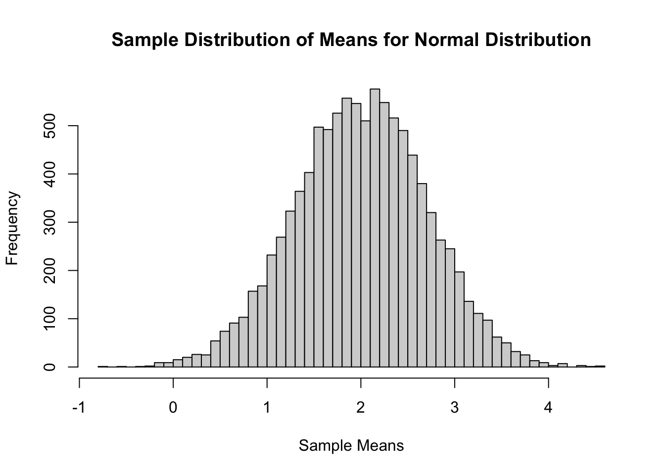 sample.size <-50simulation.size <-10000X1 <-matrix(data=rnorm(n=(sample.size*simulation.size), mean=2, sd=5), nrow=simulation.size, ncol=sample.size, byrow=TRUE)X2 <-matrix(data=runif(n=(sample.size*simulation.size), min=5, max=105), nrow=simulation.size, ncol=sample.size, byrow=TRUE)X3 <-matrix(data=(rexp(n=(sample.size*simulation.size)) +3), nrow=simulation.size, ncol=sample.size, byrow=TRUE)Mean.X1 <-apply(X1,1,mean)Mean.X2 <-apply(X2,1,mean)Mean.X3 <-apply(X3,1,mean)hist(Mean.X1, breaks=50, main='Sample Distribution of Means for Normal Distribution', xlab='Sample Means')
