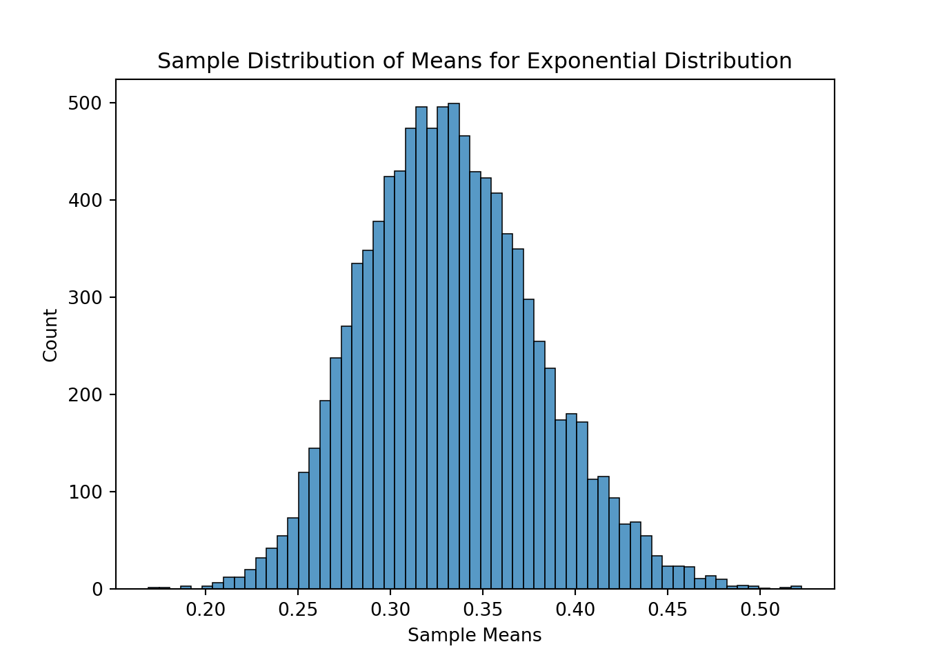 ---title: "Theory Assessment"format: html: code-fold: show code-tools: trueeditor: visual---```{r}#| include: falselibrary(reticulate)use_condaenv("r-main")```# Closed Form SolutionsIn mathematics and statistics, there are popular theories involving distributions of known values. The Central Limit Theorem is one of them. We don't need complicated mathematics for us to approximate distributional assumptions when we use simulations. This is especially helpful when finding a **closed form solution** is very difficult, if not impossible. A closed form solution to a mathematical/statistical distribution problem means that you can mathematically calculate the distribution through equations. Real world data can be very complicated and may change based on different inputs which each have their own unique distribution. Simulation can reveal an approximation of these output distributions.The next two sections work through some examples of this.# Central Limit TheoremAssume you do not know the Central Limit Theorem, but want to study and understand the sampling distribution of sample means. You take samples of size 10, 50, and 100 from the following three population distributions and calculate the sample means repeatedly:1. Normal distribution2. Uniform distribution3. Exponential distributionLet's use our software to simulate the sampling distributions of sample means across each of the above distributions and sample sizes!::: {.panel-tabset .nav-pills}## RThis simulation can easily be done in R without the use of loops. First, we set the sample size and simulation size of the simulation. Next, we just randomly sample from each of the above distributions using the `rnorm`, `runif`, and `rexp` functions. In each of these functions we sample as many observations we would need across all simulations which is the product of the sample size with the simulation size. We then use the `matrix` function to take the draws from the random sampling functions and allocate the observations across rows and columns of a matrix. Specifically, we will use the rows as simulations, and columns as samples. Lastly, we just use the `apply` function for each matrix and apply the `mean` function to each row (or simulation). From there we can plot the distributions of the sample means.```{r}#| message: false#| error: false#| warning: falsesample.size <-50simulation.size <-10000X1 <-matrix(data=rnorm(n=(sample.size*simulation.size), mean=2, sd=5), nrow=simulation.size, ncol=sample.size, byrow=TRUE)X2 <-matrix(data=runif(n=(sample.size*simulation.size), min=5, max=105), nrow=simulation.size, ncol=sample.size, byrow=TRUE)X3 <-matrix(data=(rexp(n=(sample.size*simulation.size)) +3), nrow=simulation.size, ncol=sample.size, byrow=TRUE)Mean.X1 <-apply(X1,1,mean)Mean.X2 <-apply(X2,1,mean)Mean.X3 <-apply(X3,1,mean)hist(Mean.X1, breaks=50, main='Sample Distribution of Means for Normal Distribution', xlab='Sample Means')hist(Mean.X2, breaks=50, main='Sample Distribution of Means for Uniform Distribution', xlab='Sample Means')hist(Mean.X3, breaks=50, main='Sample Distribution of Means for Exponential Distribution', xlab='Sample Means')```The example above shows sampling distributions for the mean when the sample size is 50. Easily changing that piece of the code will allow the user to see these sampling distributions at different sample sizes.As you can see above, the sampling distribution for the sample means is approximately normally distributed, regardless of the population distribution, as long as the sample size is big enough.## PythonThis simulation can easily be done in Python without the use of loops. First, we set the sample size and simulation size of the simulation. Next, we just randomly sample from each of the above distributions using the `random.normal`, `random.uniform`, and `random.exponential` functions from `numpy`. In each of these functions we sample as many observations we would need across all simulations which is the product of the sample size with the simulation size. We then use the `reshape` function on these arrays to take the draws from the random sampling functions and allocate the observations across rows and columns of an array. Specifically, we will use the rows as simulations, and columns as samples. Lastly, we just use the `mean` function for each array and apply the `axis = 1` option to each row (or simulation). From there we can plot the distributions of the sample means.```{python}#| message: false#| error: false#| warning: falseimport numpy as npsample_size =50simulation_size =10000X1 = np.random.normal(loc =0.04, scale =0.07, size = sample_size*simulation_size).reshape(simulation_size, sample_size)X2 = np.random.uniform(low =5, high =105, size = sample_size*simulation_size).reshape(simulation_size, sample_size)X3 = np.random.exponential(scale =0.333, size = sample_size*simulation_size).reshape(simulation_size, sample_size)Mean_X1 = X1.mean(axis =1)Mean_X2 = X2.mean(axis =1)Mean_X3 = X3.mean(axis =1)``````{python}#| message: false#| error: false#| warning: falseimport seaborn as snsimport matplotlib.pyplot as pltax = sns.histplot(data = Mean_X1)ax.set_title('Sample Distribution of Means for Normal Distribution')ax.set_xlabel("Sample Means")``````{python}#| message: false#| error: false#| warning: falseax = sns.histplot(data = Mean_X2)ax.set_title('Sample Distribution of Means for Uniform Distribution')ax.set_xlabel("Sample Means")``````{python}#| message: false#| error: false#| warning: falseax = sns.histplot(data = Mean_X3)ax.set_title('Sample Distribution of Means for Exponential Distribution')ax.set_xlabel("Sample Means")```The example above shows sampling distributions for the mean when the sample size is 50. Easily changing that piece of the code will allow the user to see these sampling distributions at different sample sizes.As you can see above, the sampling distribution for the sample means is approximately normally distributed, regardless of the population distribution, as long as the sam